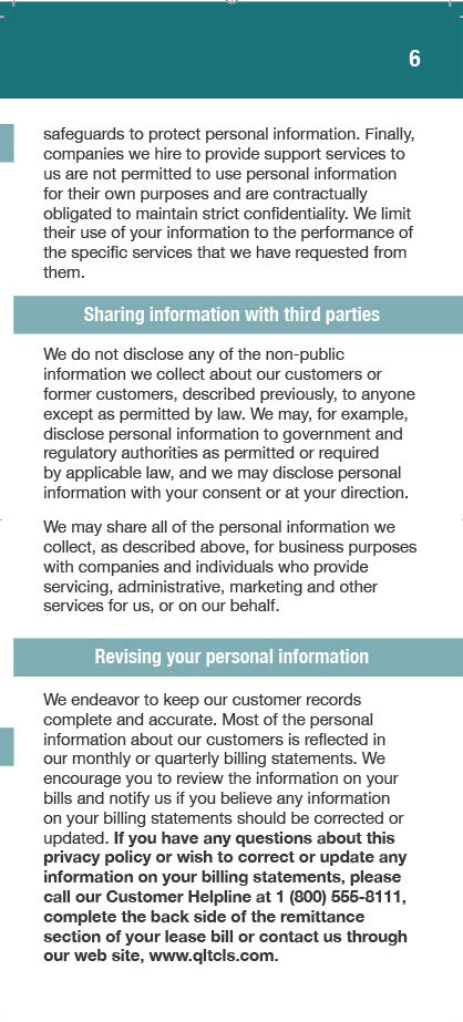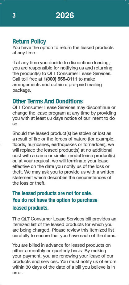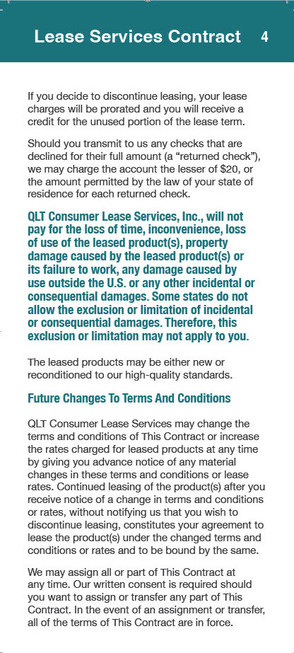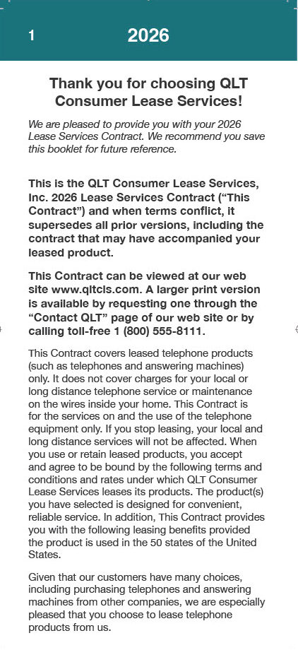 Lease Service Contractaida@aeadvertising.com2025-12-11T15:41:11-05:00 This is the QLT Consumer Lease Services, Inc. 2026 Lease Service Contract (“This Contract”) and when terms conflict, it supersedes all prior versions, including the contract that may have accompanied your leased product.† Click here to download in PDF format.